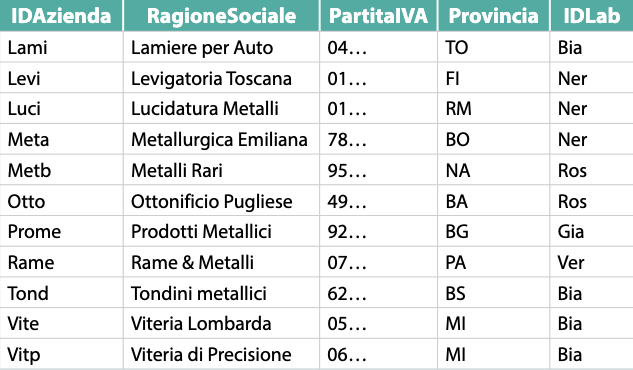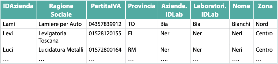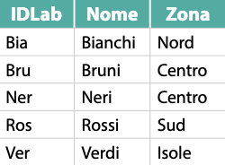 Applicazione della congiunzione $ \text{Aziende.IDLab} \= \text{Laboratori.IDLab}$ partendo dalle seguenti tabelle: