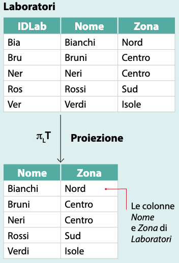 La **proiezione** su una tabella T genera una nuova tabella estraendo dalla tabella iniziale solo le colonne elencate nella lista L. La proiezione è indicata con la scrittura: $\pi\_{L}(T)$ dove il simbolo di proiezione $\pi$(pi greco) è seguito dal nome della tabella **T** sulla quale viene operata la proiezione. La lista **L**, che elenca le colonne da estrarre da **T**, viene riportata come indice di $\pi$.