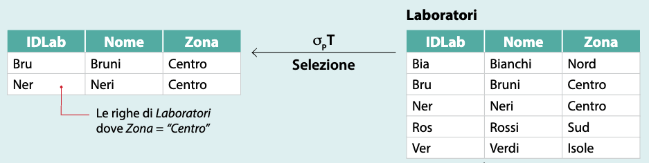La **selezione** su una tabella T genera una nuova tabella costituita solo dalle n-uple della tabella di partenza che soddisfano una determinata condizione **P**. La selezione viene indicata con la scrittura: $\sigma\_{P}(T)$ dove il simbolo di selezione $\sigma$(sigma) è seguito dal nome della tabella **T** sulla quale viene operata la selezione. La proprietà **P**, che caratterizza l’operazione di selezione, viene scritta come indice di $\sigma$. La scrittura $\sigma\_{P}(T)$ indica quindi un'operazione su **T** che estrae le sole righe per le quali la proprietà **P** è vera.